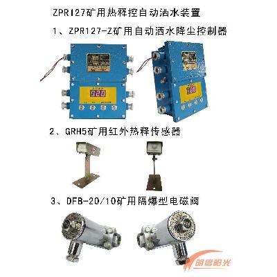 1.1 ZPR127矿用热释控自动洒水装置(以下简称装置)。该装置是由矿用自动洒水降尘装置控制器、矿用防爆电磁阀和矿用自动洒水降尘装置传感器组成。主要用于煤矿井下运输大巷粉尘作业场所。通过自动洒水,不仅降尘除尘、烟雾、净化空气,同时还能吸收一定的有害气体,降低瓦斯、甲烷、一氧化碳等有害气体浓度,改善和治理粉尘作业环境,是有效防止粉尘、烟雾危害的安全管理设备。